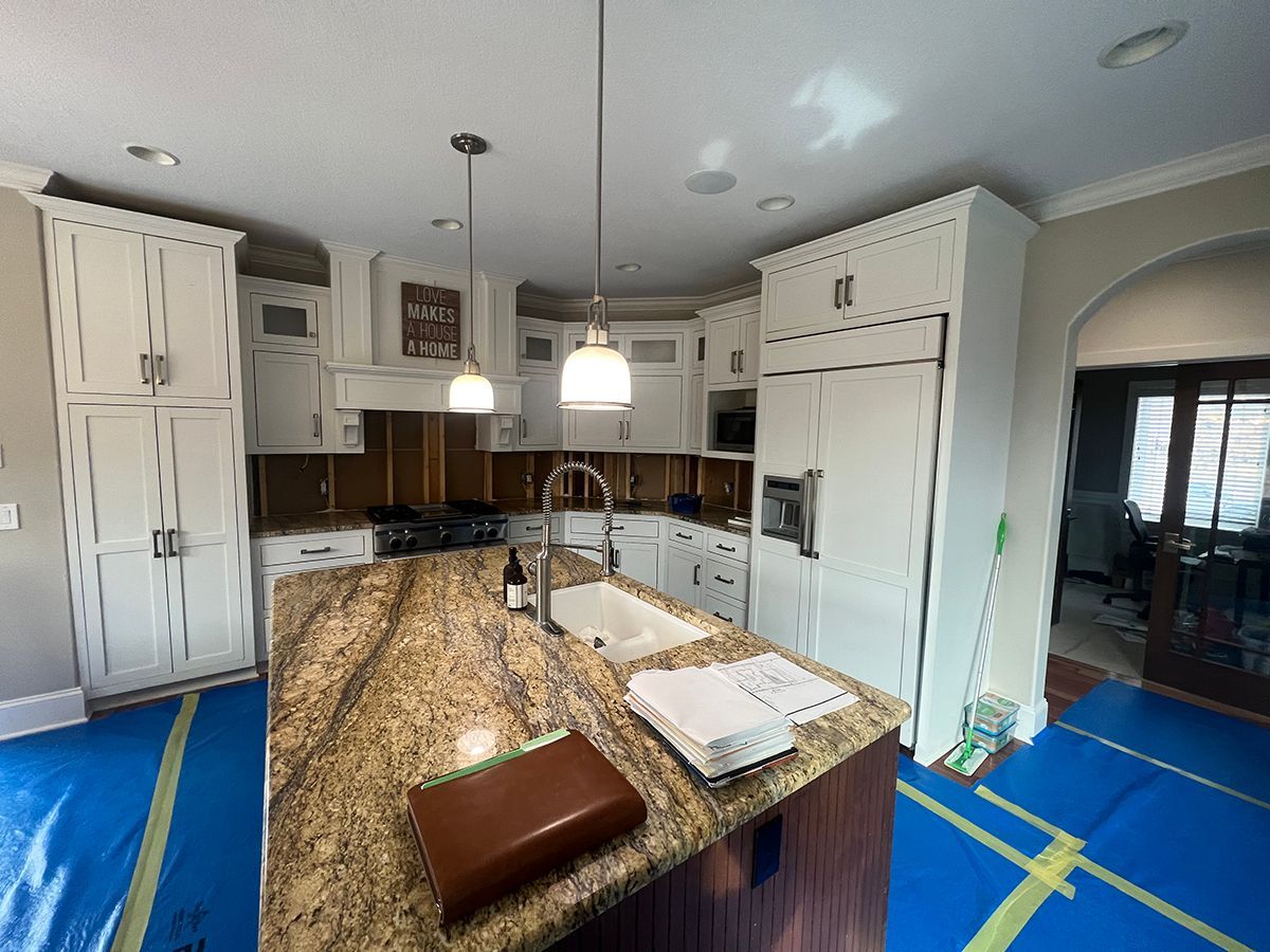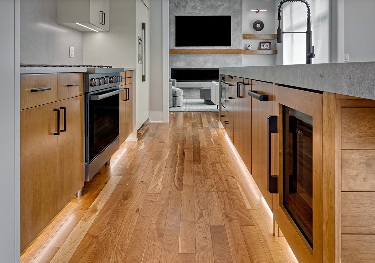 The kitchen serves as the heart of this remodel, featuring custom cherry cabinetry paired with painted Pacific Fog perimeter cabinets and porcelain slab countertops with mitered waterfall edges on both the island and fireplace surround. The island’s cherry shiplap paneling, accented by LED toe-kick and undercabinet lighting, enhances depth and warmth for a sophisticated yet functional centerpiece.