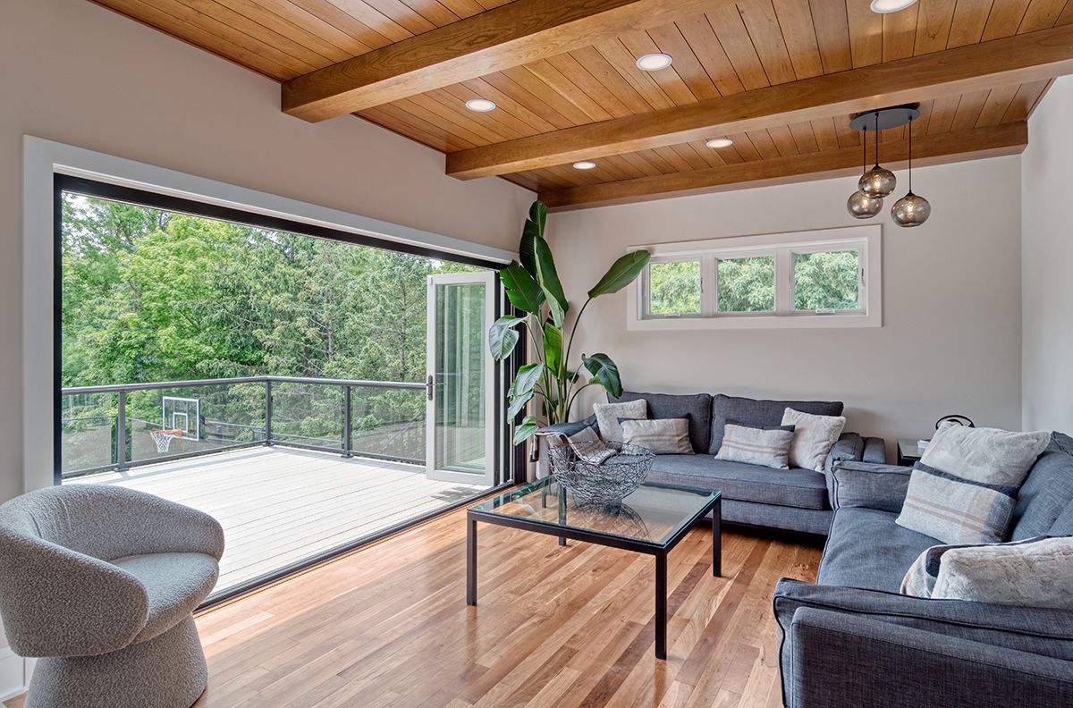 Throughout the home, American cherry hardwood floors complement the modern palette, while LVP and carpet in the new addition add comfort and durability. The exterior continues this cohesive design with Hardie Timber Bark siding, Edco Desert Tone finishes, and an Azek French White Oak deck framed by Westbury glass railings, creating a timeless connection between indoor and outdoor living.